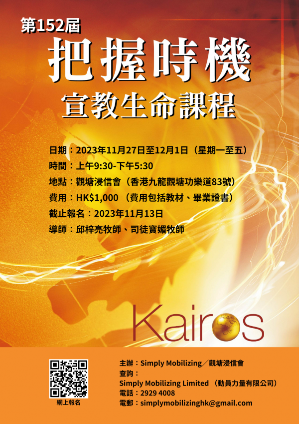 有意進深認識宣教的朋友,邀請你參加「152 屆把握時機 Kairos」課程,完整地從「聖經、歷史、文化、策略」四個面向學習宣教,讓生命更有系統地進一步轉化為福音精兵。