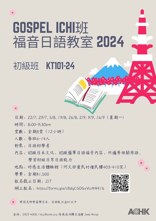 期望透過這入門級的 8 堂的福音日語班,你能認識日本生活文化,簡單明白福音日語,學習基本祈禱技巧,於短宣或訪宣上使用。