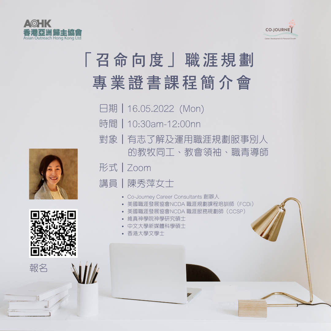 「召命向度」職涯規劃專業證書課程簡介會 日期:2022年5月16日(一) 時間:上午10時半至中午12時 對象:有志了解及運用職涯規劃服事別人的教牧同工、教會領袖、職青導師 形式:Zoom 講員:陳秀萍女士 -Co-Journey Career Consultants [...]