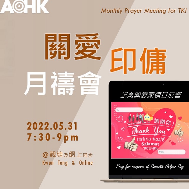 五月份「關愛印傭月禱會」 日期:2022年5月31日(星期二) 時間:晚上7時半至9時正 主題:分享堂會/ 身邊弟兄姊妹對5月29日「關愛家傭日」的反響 月禱會將實體及網上同步進行,請務必報名(5985 8140 / events@aohk.org),敬請提供:姓名、堂會名稱、聯絡電話、電郵。實體名額有限,到場者須打了2針疫苗 [...]