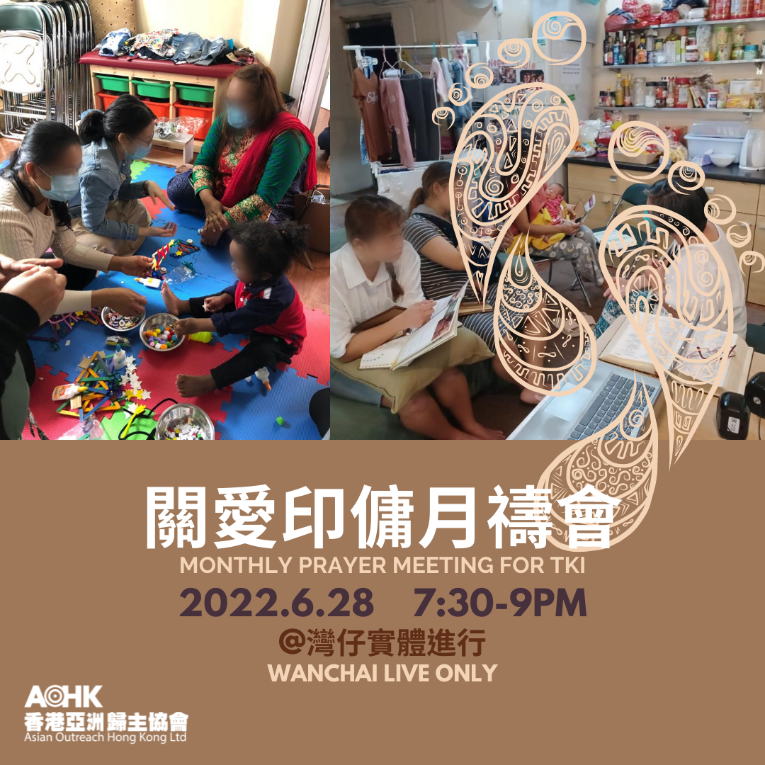 六月份 「關愛印傭月禱會」 我們又走出去啦 日期:2022年6月28日(星期二) 時間:晚上7時半至9時正 地點:灣仔(地址將在報名確認後個別通知) 主題:認識、以禱告祝福一小堂會對一群印尼媽媽的服事 是次月禱會將只以實體進行,名額有限,請務必報名(5985 8140 [...]