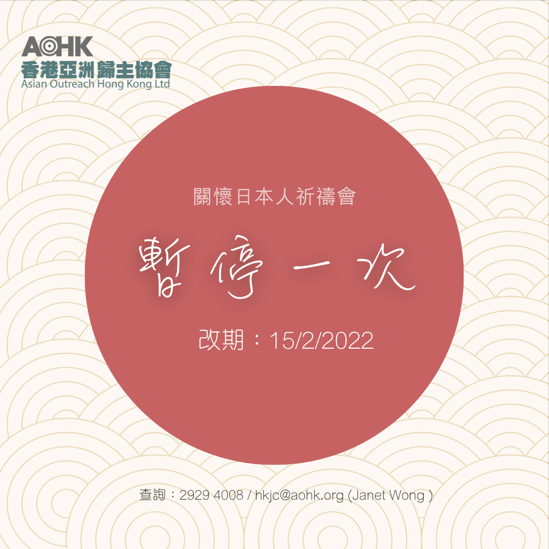 關懷日本人祈禱會 因應近日疫情狀況及抗疫政策,以及為保障各位參加祈禱會弟兄姊妹的安全,本會決定將原定1月18日舉行的祈禱會暫停一次,改為2月15日舉行。 願主祝福大家! 查詢:2929 4008 Janet Wong [...]