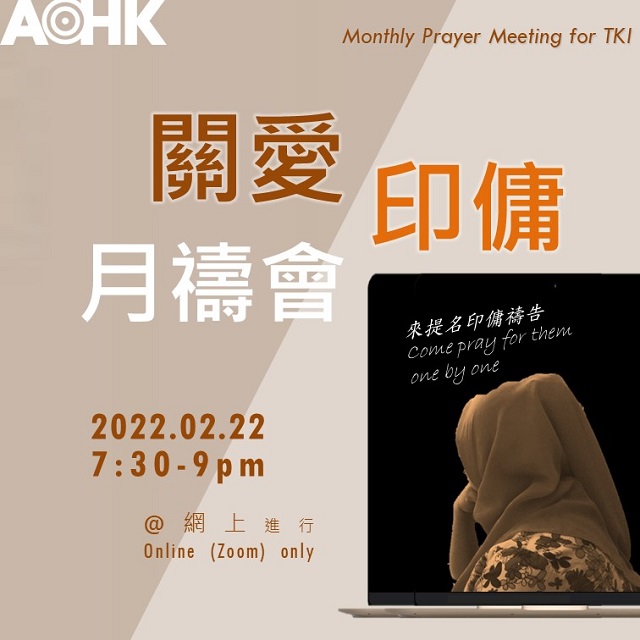 香港亞協本月「關愛印傭月禱會」,誠邀同心提名為印尼姐姐禱告。如有需要,分享時可以代名代表姐姐,願我們借此更留心所認識的姐姐個別的需要。 日期:2022年2月22日(星期二) 時間:晚上七時半至九時正 以網上平台Zoom進行(超連結和密碼將於報名確認後個別通知) 請務必報名: events@aohk.org / WhatsApp/ Signal: 5985-8140 [...]