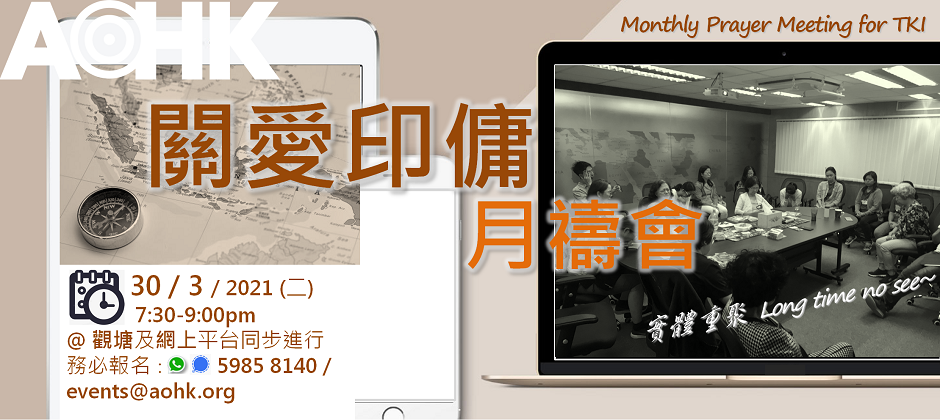 本月份「關愛印傭月禱會」,我們會預覽「Pray4TKI 為印傭禱告」手冊並用當中的禱文來祈禱。聚會詳情如下: 日期:2021年4月27日(星期二) 時間:晚上七時半至九時正 地點:實體與網上同步進行(確實地點和連結將於報名確認後個別通知) 請務必報名 (events@aohk.org / Whatsapp/ [...]