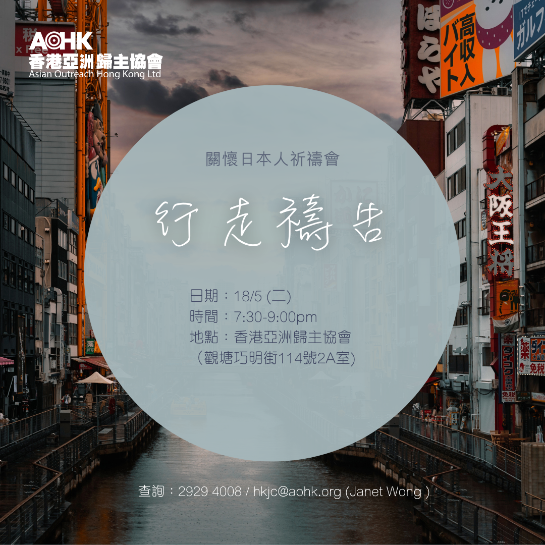 疫情令我們暫時未能踏足日本,但我們仍可以繼續為日本禱告,為日本行走禱告(Prayer Walk)。 今次將會以實體形式進行祈禱會,邀請大家出席祈禱會,一同為日本禱告! 日期:18/5 (二) 時間:7:30-9:00pm 地點:亞協辦事處(觀塘巧明街114號2A室) 查詢:2929 4008 [...]