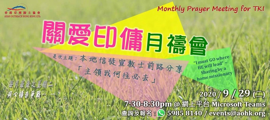 本月份「關愛印傭月禱會」,我們會預覽「Pray4TKI 為印傭禱告」手冊並用當中的禱文來祈禱。聚會詳情如下: 日期:2021年4月27日(星期二) 時間:晚上七時半至九時正 地點:實體與網上同步進行(確實地點和連結將於報名確認後個別通知) 請務必報名 (events@aohk.org / Whatsapp/ [...]